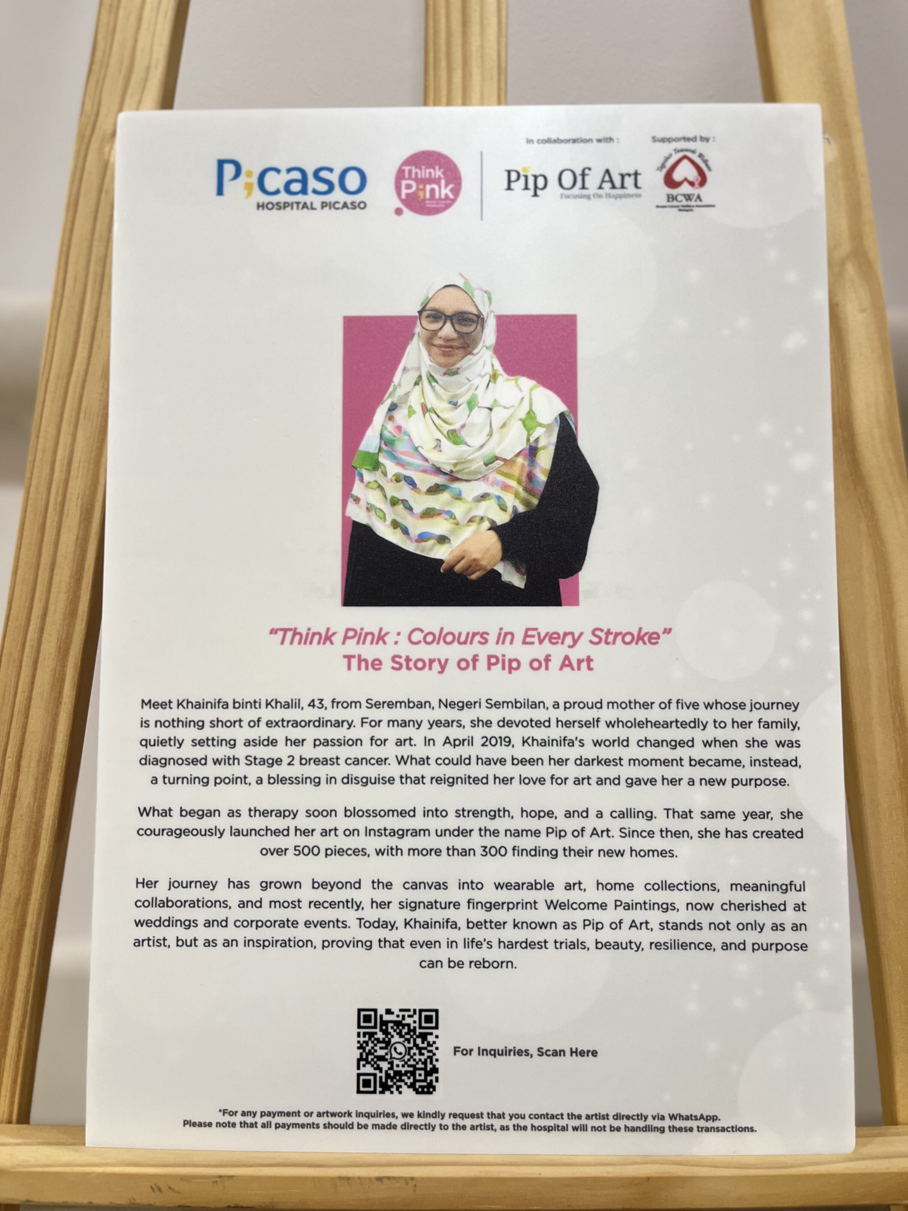 As part of our commitment to giving back, we have collaborated with Pip of The Art to bring a special initiative to life. Beautiful artworks are showcased on Level 2, near our Can-Care Centre. A portion of every piece sold will go towards supporting the Breast Cancer Welfare Association (BCWA), helping to fund their ongoing efforts in patient support and breast cancer awareness.
