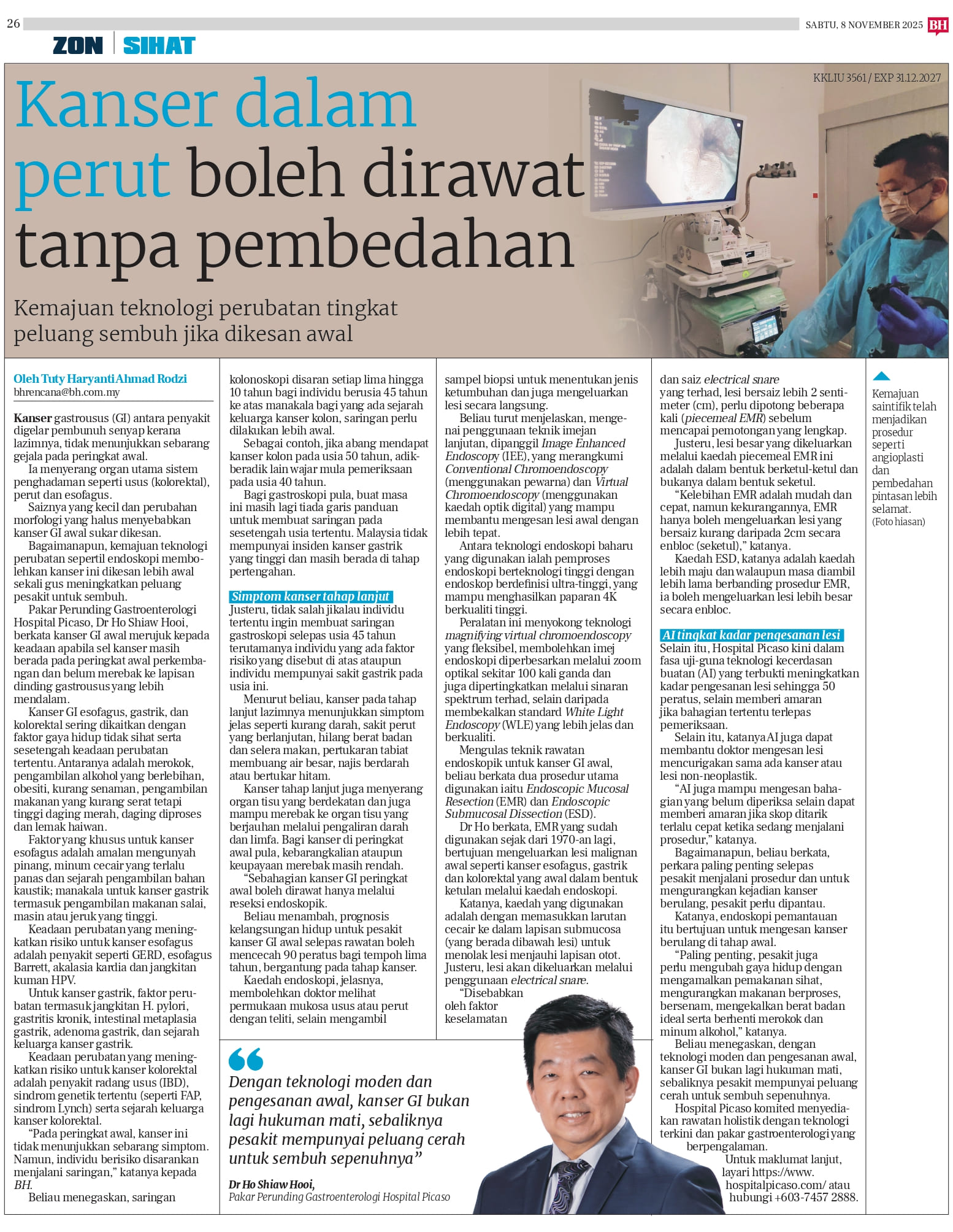 Kanser dalam perut boleh dirawat tanpa pembedahan (Berita Harian, 10 November 2025)
