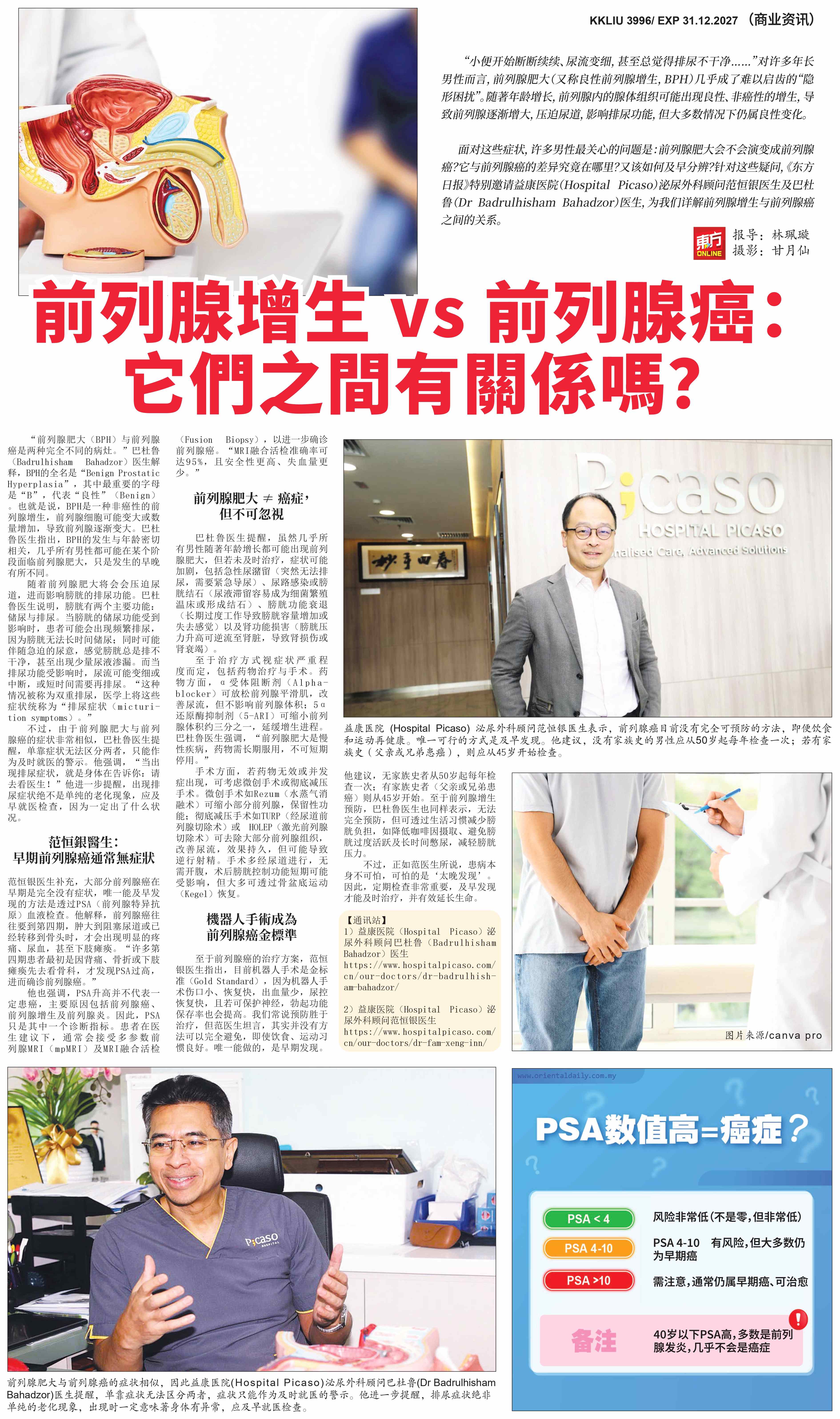 面对这些症状,许多男性最关心的问题是:前列腺肥大会不会演变成前列腺癌?它与前列腺癌的差异究竟在哪里?又该如何及早分辨?针对这些疑问,《东方日报》特别邀请益康医院(Hospital Picaso)泌尿外科顾问范恒银医生及巴杜鲁(Dr Badrulhisham Bahadzor)医生,为我们详解前列腺增生与前列腺癌之间的关系。